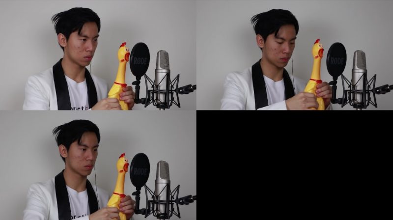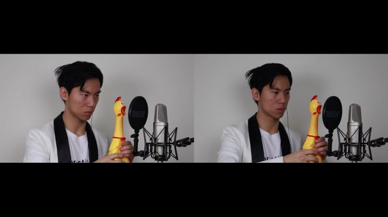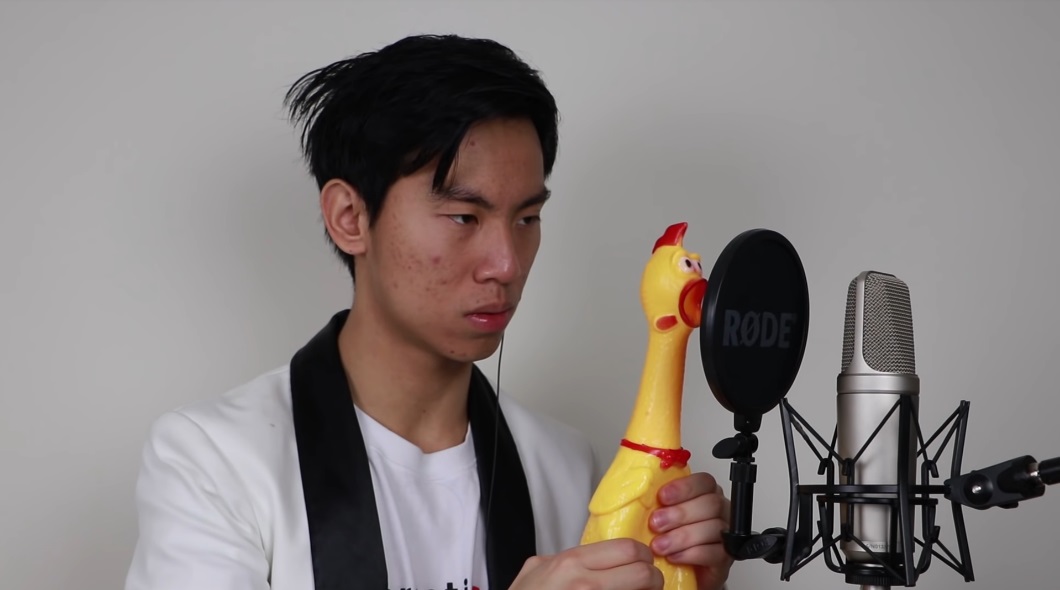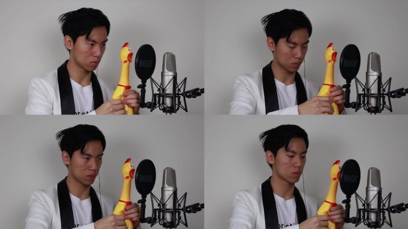 The two-minute number begins with Chen squeezing the rubber chicken in one frame.