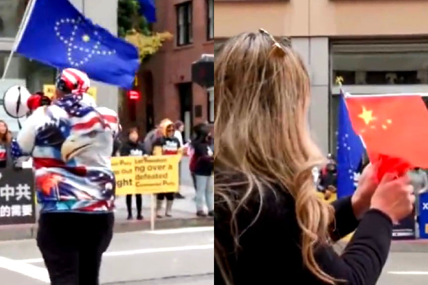 - Coordinated violence and intimidation: While aggression was observed on both sides, pro-CCP activists, some with ties to the Chinese state, reportedly instigated “the most extreme violence” against anti-Xi protesters during Xi’s visit for the Asia-Pacific Economic Cooperation (APEC) summit, attacking them with items like extended flagpoles and chemical sprays. Verified videos show coordinated groups of young men embedded among pro-CCP demonstrators, who were seen punching, kicking and even throwing sand in the faces of dissenters. Chinese diplomats from San Francisco and Los Angeles were identified among the crowd directly interacting with aggressors. One protester, Zhang Kaiyu, who was beaten unconscious, told the Post, “Everywhere we went … we were outnumbered and overwhelmed by the pro-CCP people.”