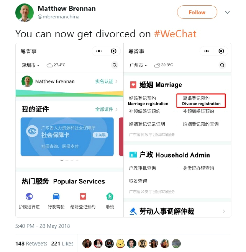 Married couples in China are now able to file for divorce on Tencent’s WeChat, the country’s equivalent of Facebook Messenger.