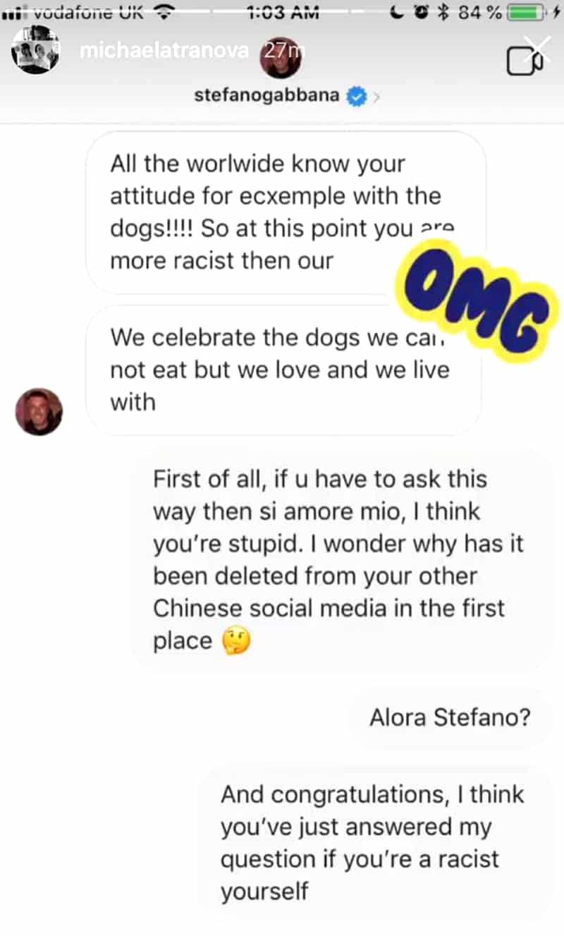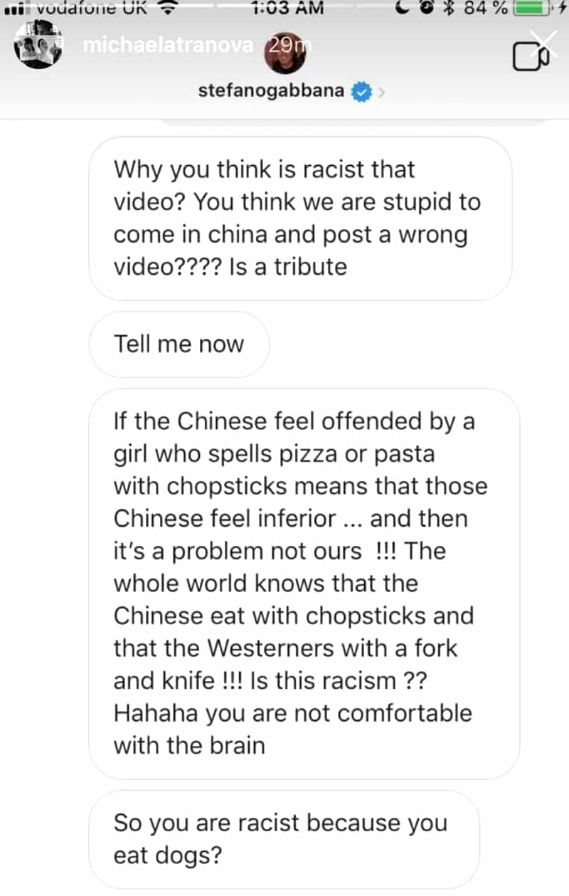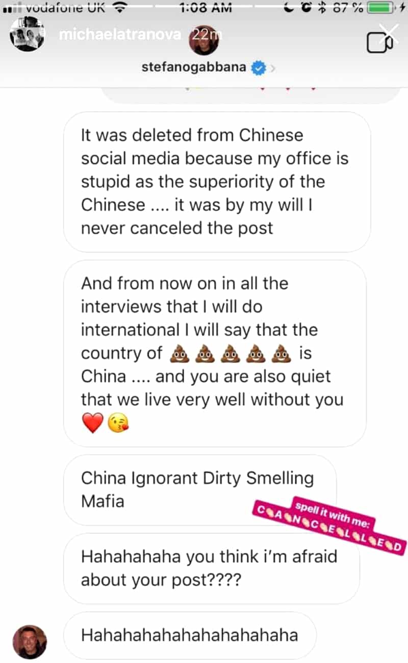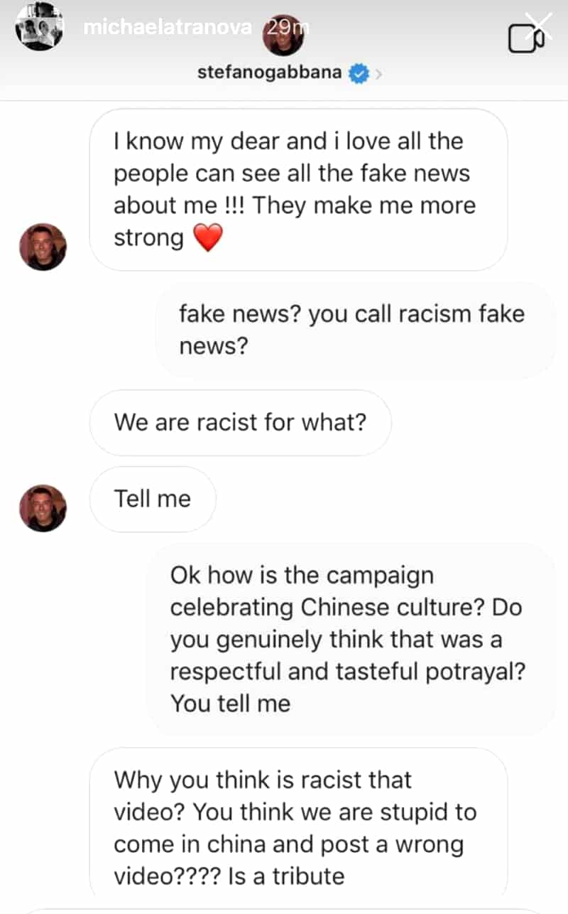The campaign was accused of racism and D&G co-founder Stefano Gabbana added fuel to the fire after screenshots of his messages on social media describing China as a “country of sh**,” made the internet rounds.