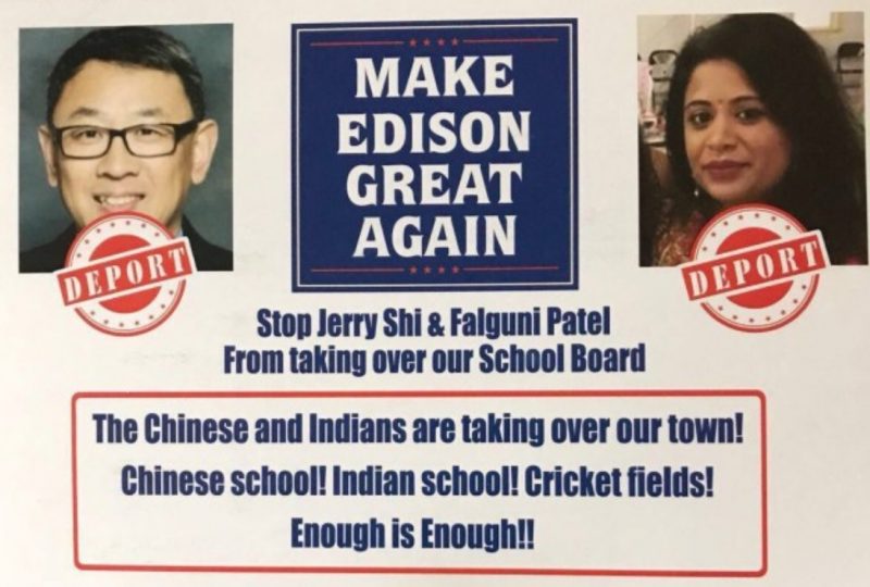 Racist campaign fliers containing anti-Indian and anti-Chinese messages were recently sent out to residents of Edison, New Jersey in a brazen attack against two Asian American school board candidates.