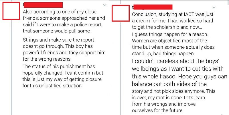 The female student’s parents, worried for their daughter, thought it best she drop her opportunity to attend IACT and go to a different school. Eventually, the college promised to take action, and it was revealed later that some of those involved have already apologized privately to the girl involved.