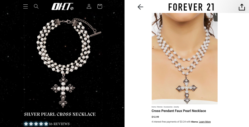 “We have been selling our Pearl Cross Necklace since January, 2021, and recently @forever21 released a ‘Cross Pendant Faux Pearl Necklace’ which mimics our EXACT design,” OHTNYC wrote. “Hours were spent by our team brainstorming, perfecting, and making this design a reality. Each of our items are designed with utmost detail, and we create all of our designs with love and care. So it’s sad to see our design, which we began making by hand in New York for almost two years, reduced to a mass produced copy most likely made in unethical, fast fashion sweat shops.”