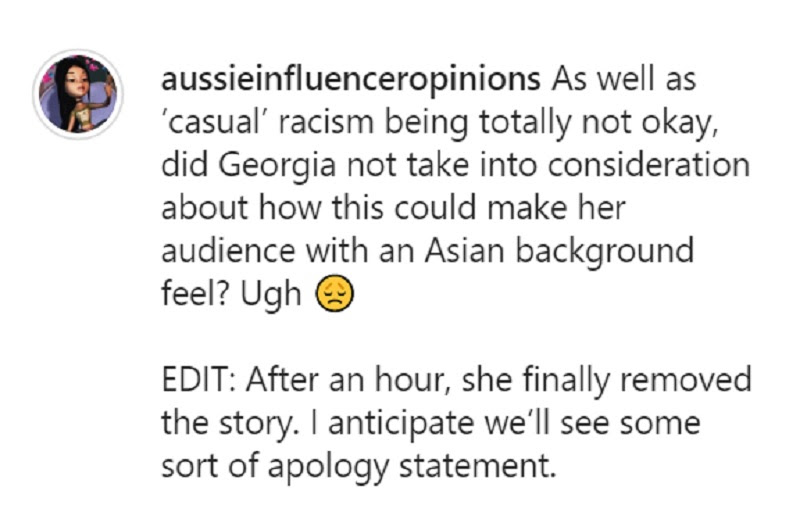 - The issue blew up after Aussie Influencer Opinions (AIO), an Instagram account that posts opinions about Australian Influencers, reposted the video on their private page. In their post, AIO said the former Bachelorette star failed to consider what her Asian audience would feel when they saw her Instagram Story.