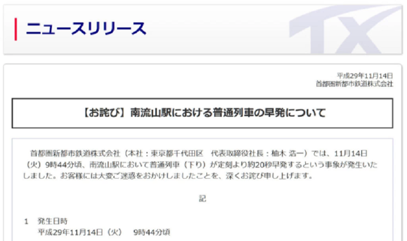 Japanese rail company Tsukuba Express has made international headlines for taking the time to apologize to the public for a minor screw up that other countries might easily ignore. In a statement, operators of the train line running between Tokyo and the city of Tsukuba expressed that they “sincerely apologize for the inconvenience” caused by the early departure.