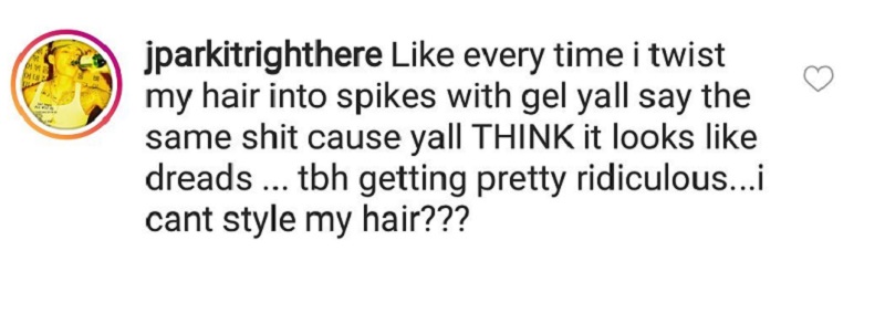 In response, Park commented: “Like every time I twist my hair into spikes with gel, y’all say the same s*** ’cause y’all THINK it looks like dreads… to be honest, this is getting pretty ridiculous… I can’t style my hair?”