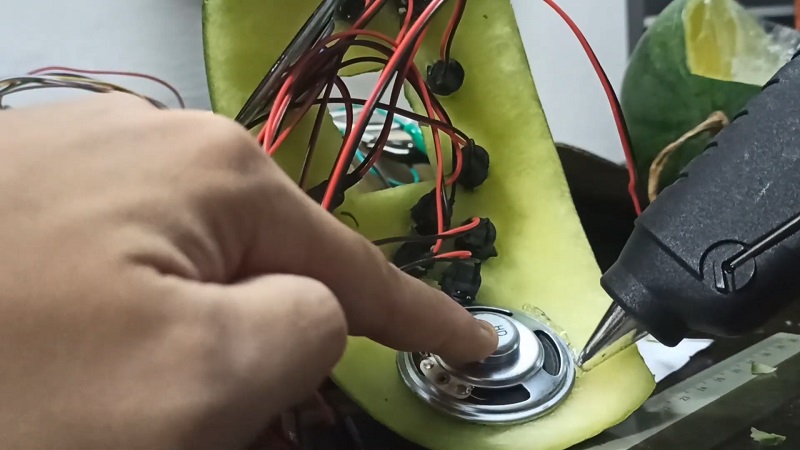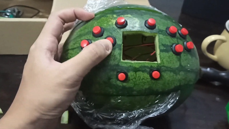 For the finishing touches, Tan cut holes in the watermelon where he could place the buttons, a 1.8-inch (45.72-millimeter) screen, loudspeakers and other wires for the connection.
