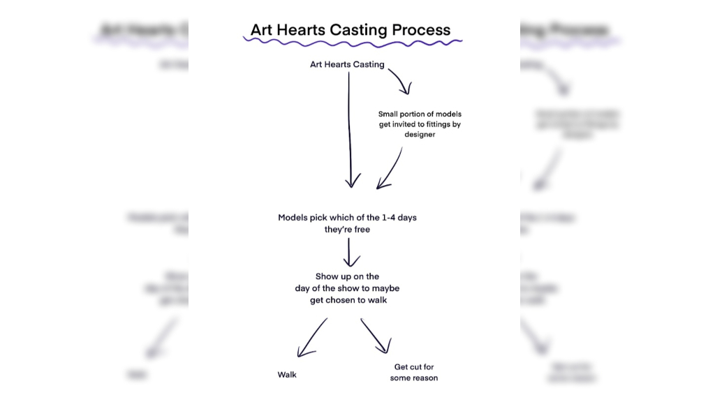 Wu says a model chosen by Art Hearts gets added to a “confirmed” list. “‘Confirmed’ just means that a model is cleared to show up on any of the four days of Fashion Week in hopes of being selected to walk on the runway,” she explains.