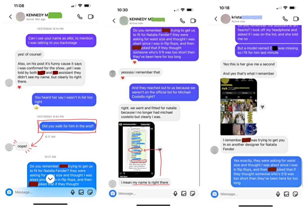 “Typically, the designer interacts with the model to get a feel for them and then have them try on a dress to see how it hangs on them. If the designer is pleased with it, they take note of the model’s name as a potential candidate to walk the runway. This is not a confirmation though. In my personal experience, I get confirmation the day before through text or I find out the day of. I did not get confirmation through text for Michael Costello.