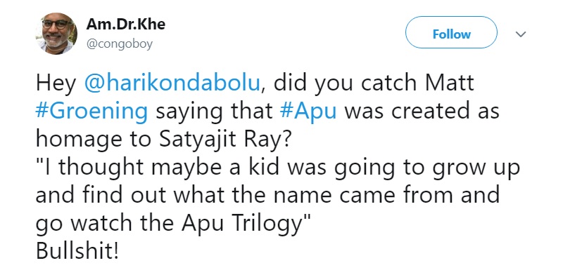“The Simpsons” creator Matt Groening said that Apu, an Indian character slammed for perpetuating stereotypes, was named after an acclaimed Indian film trilogy that he described as the “greatest films in the history of cinema.”