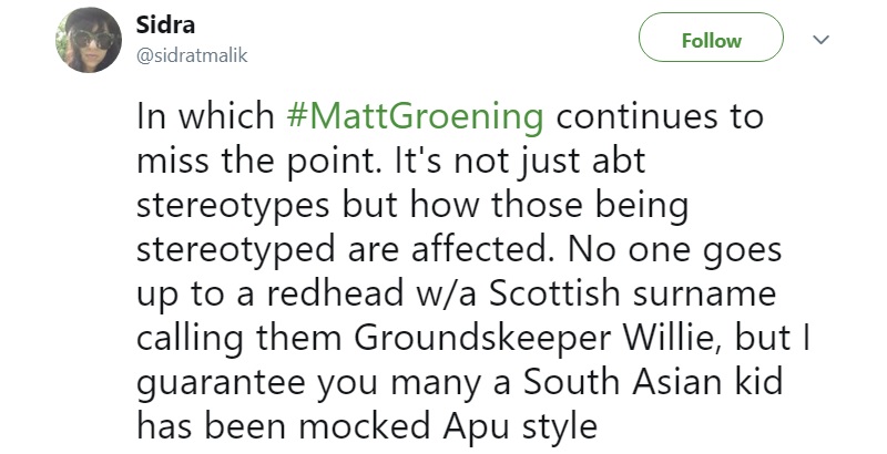 Groening affirmed that he believes the sincerity of those who expressed concerns about Apu.