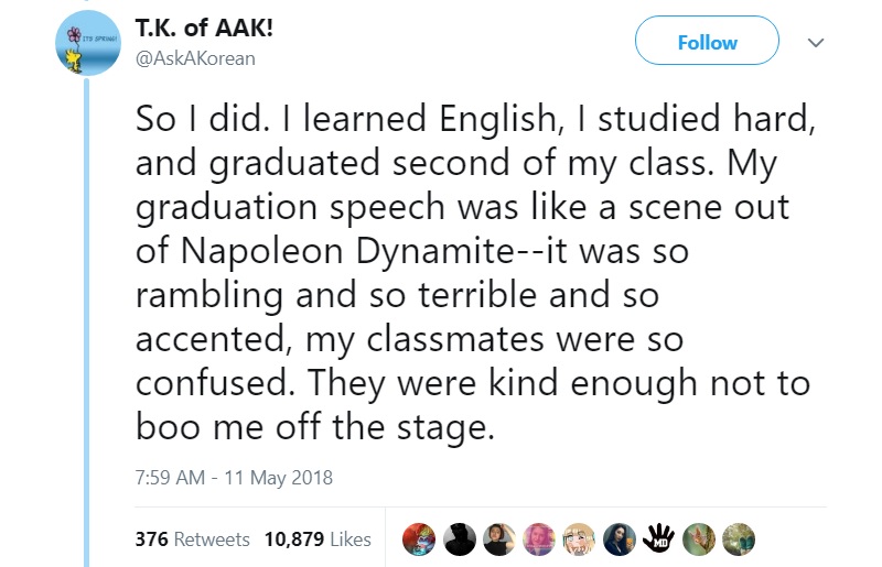 “Thanks to my teacher, I was able to prove to myself that I didn’t suddenly turn stupid. I just had to learn the new language,” he wrote.